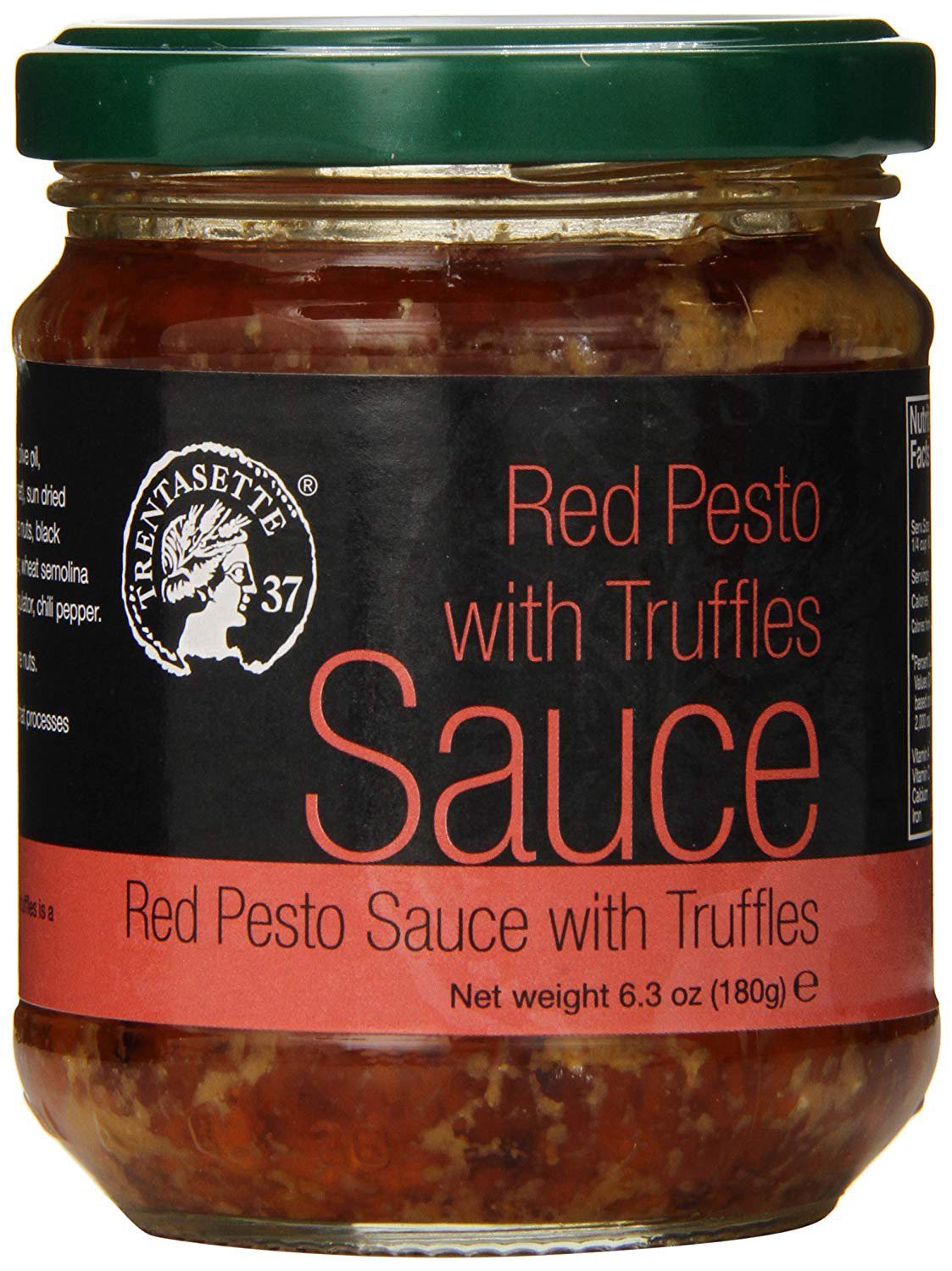 This red pesto with truffle is a delicious sauce for everything from pasta to bruschetta. This combination of tomatoes, cheeses, nuts, and truffles is a must have.