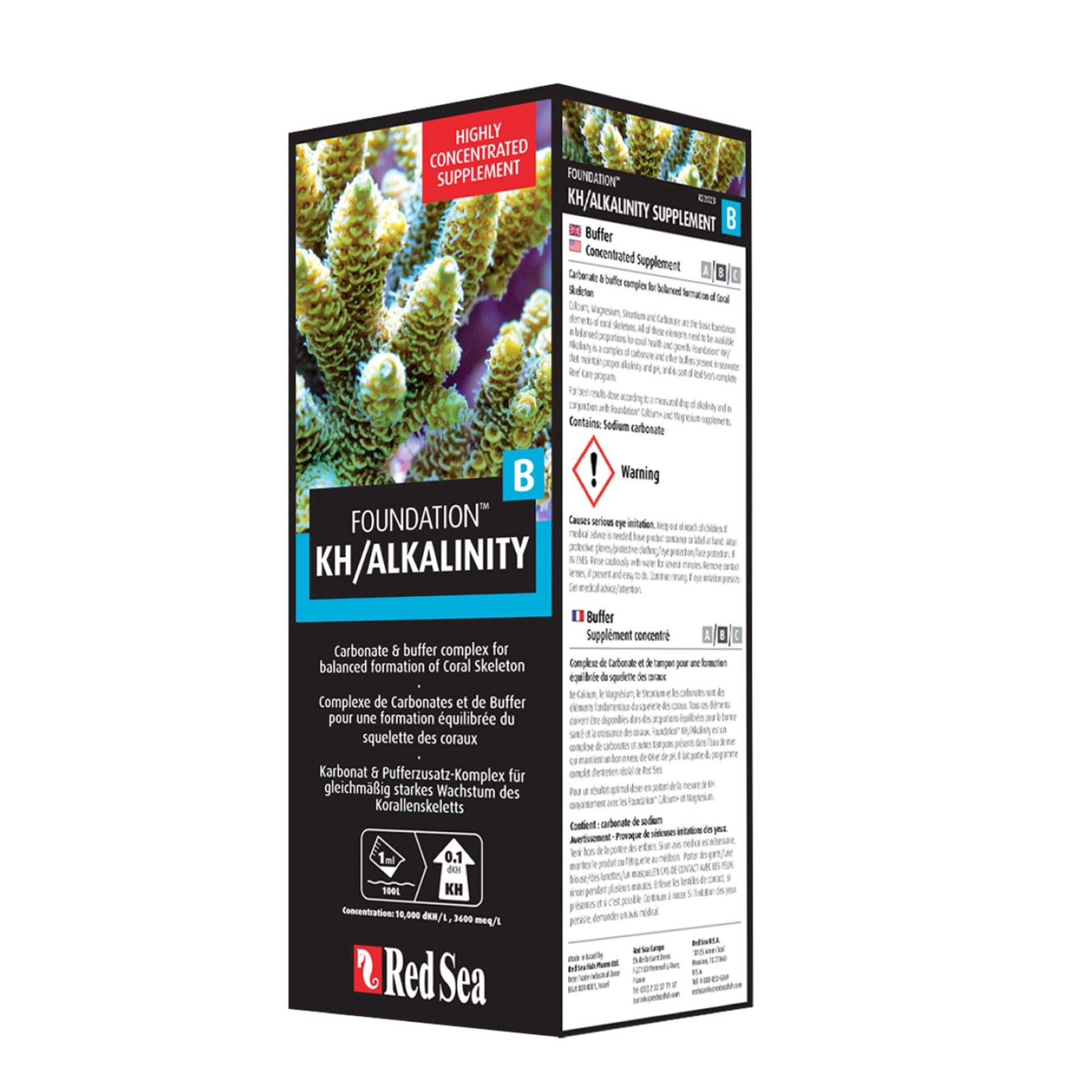 Red Sea's KH/ALKALINITY is a complex of Carbonate and other buffers present in seawater that maintain proper Alkalinity and pH, and is part of Red Sea's complete Reef Care program.