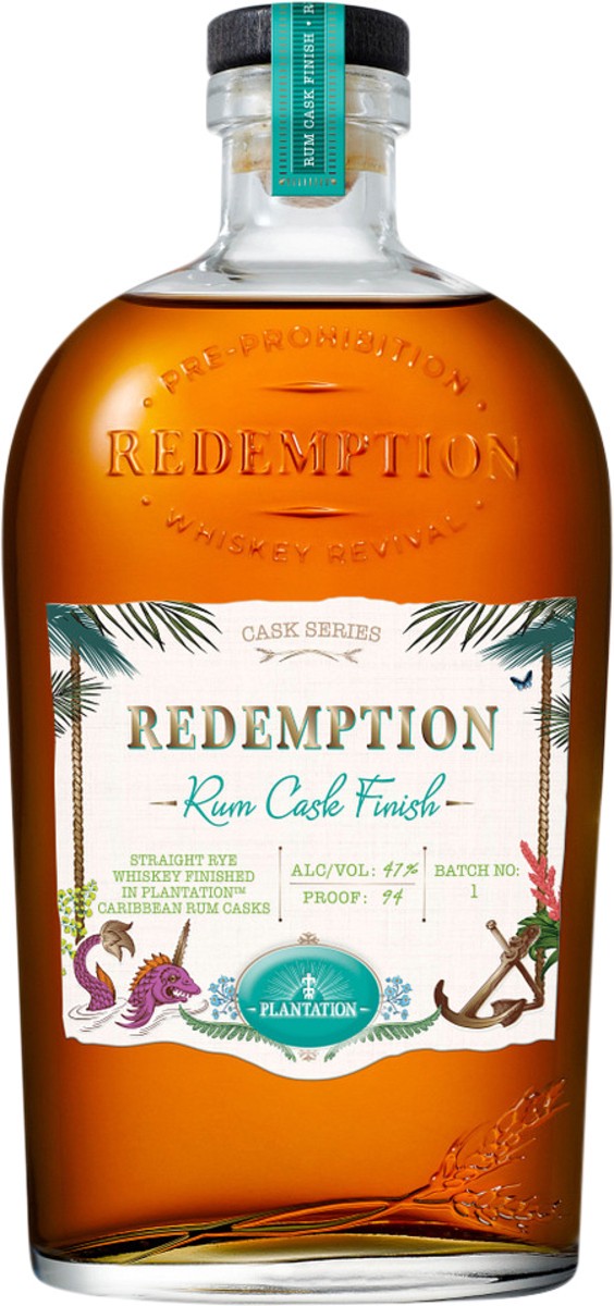 Pre-prohibition. Whiskey revival. Straight rye whiskey finished in Plantation Caribbean rum casks. redemptionwhiskey.com. Alc/Vol: 47%. 94 Distilled In the Indiana Heartland Bottled by Redemption Barr…