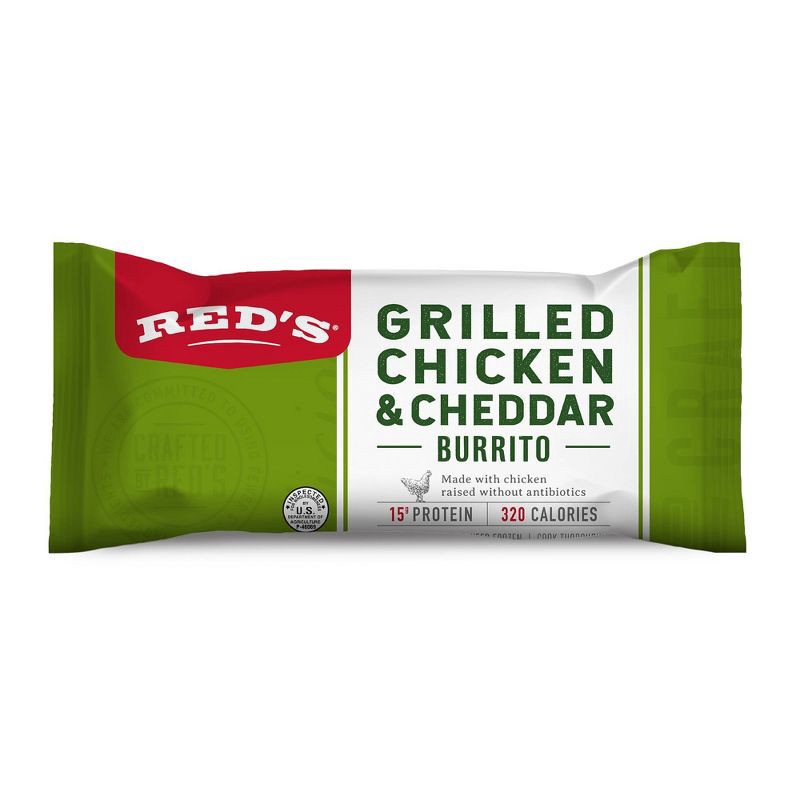 Red's premium Grilled Chicken and Cheddar Burrito is crafted with juicy grilled chicken, slow kettle-cooked pinto beans that are perfectly seasoned, wholesome brown rice, and a blend of creamy white c…