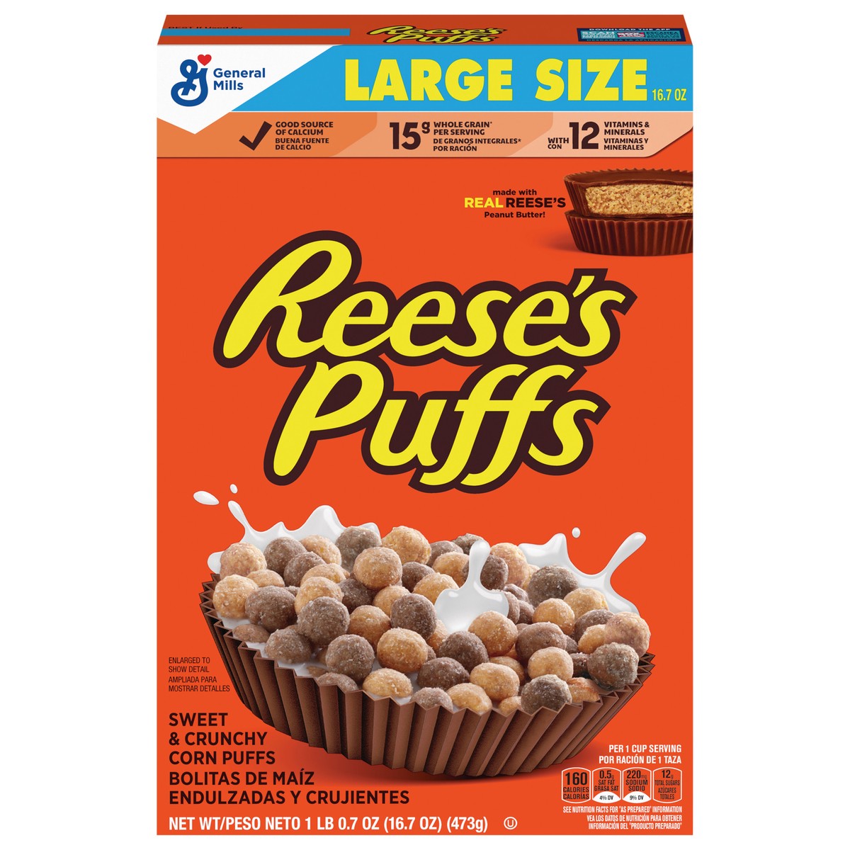 Hershey's Cocoa & Reese's peanut butter sweet and crunchy corn puffs. With whole grain, first ingredient. Box Tops for Education. Nutrition keys icons are provided to help guide food choices. They sho…