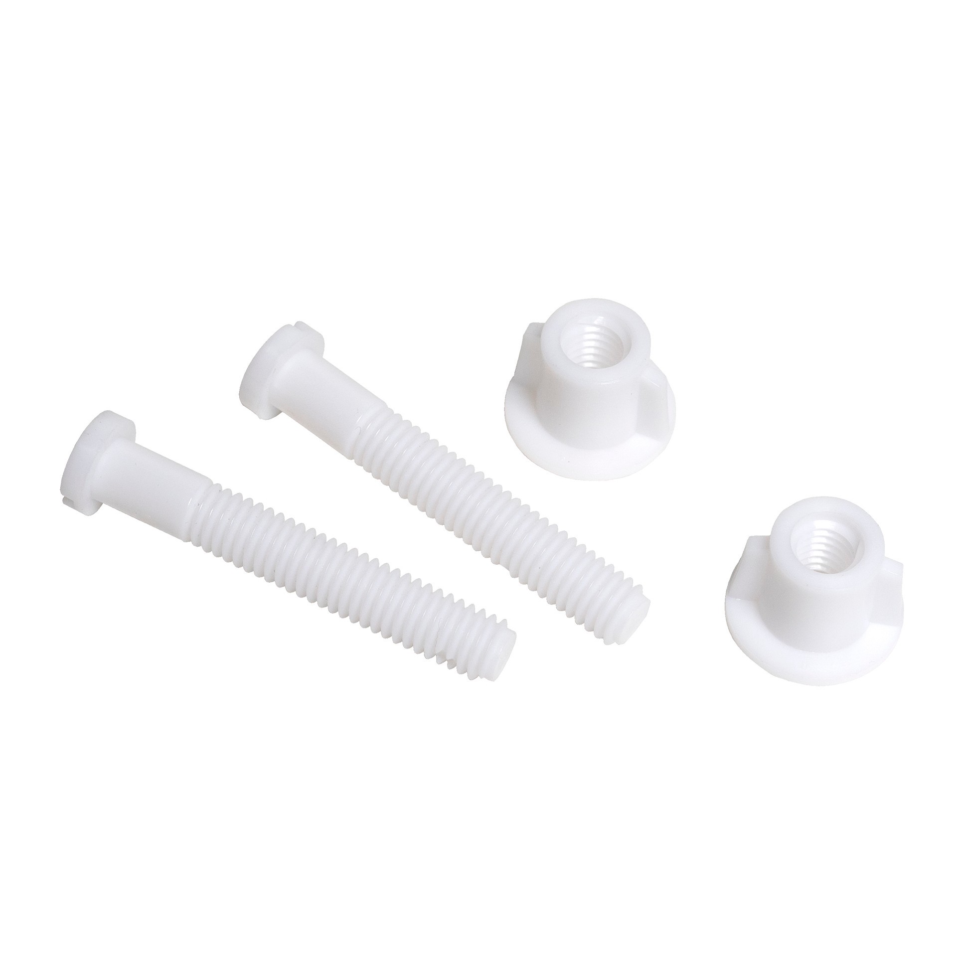 White plastic toilet seat hinge bolts. Attaches toilet seat hinge to bowl. 100% corrosion proof. Universal fit. Quick lock nuts included. (2) 3/8-in x 2-1/2-in bolts and nuts per package.