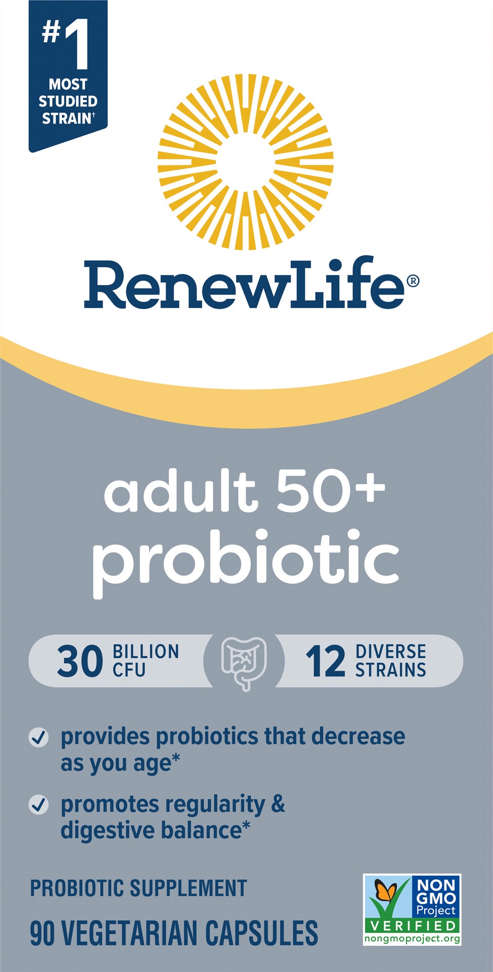 Renew Life Adult 50 Plus Probiotic offers 12 probiotic strains in easy-to-swallow capsules to support digestive health and provide immune support (1). Featuring more clinically studied strains than th…