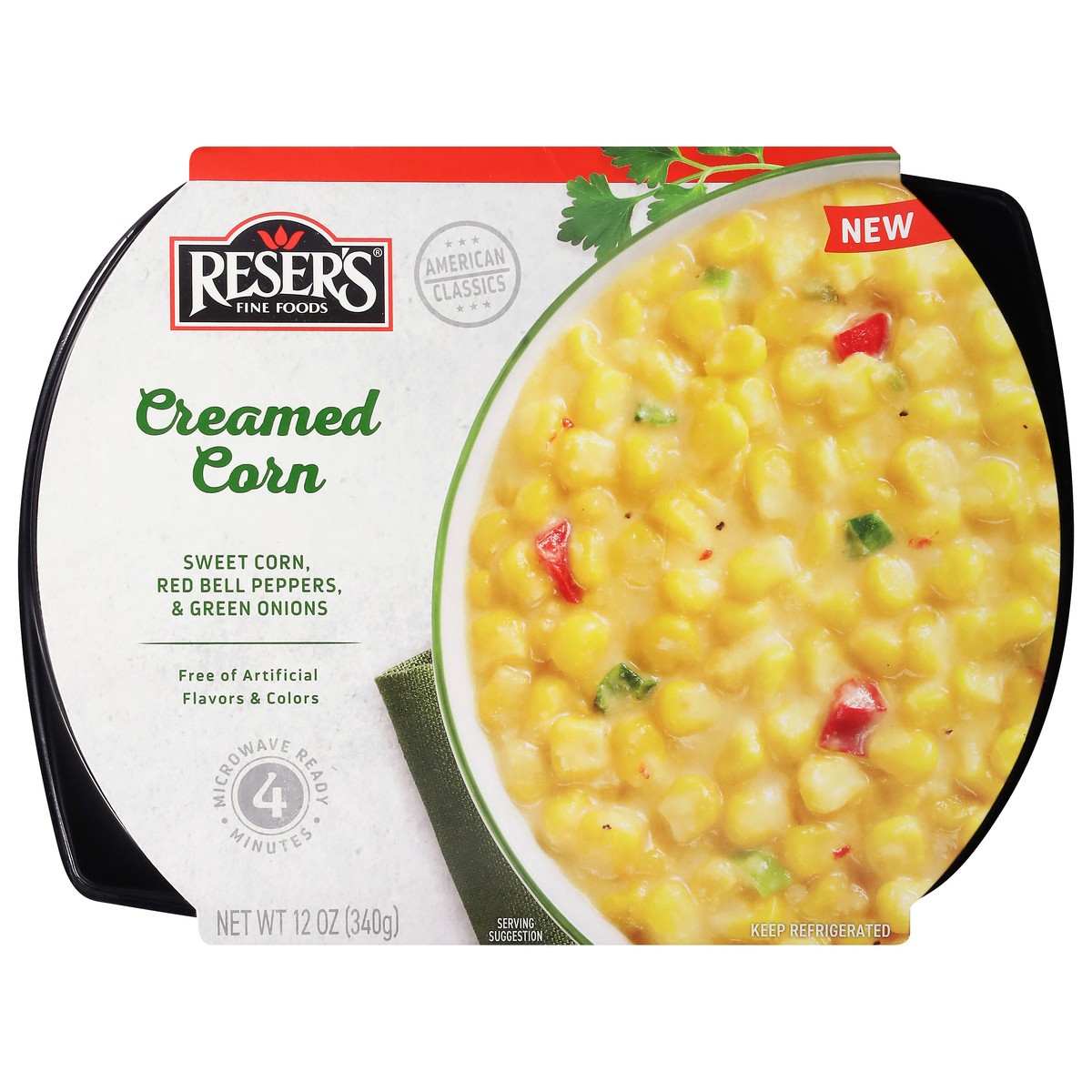Reser's Deli Sides Creamed Corn features super sweet corn kernels in a velvety sauce made with butter, milk and cream cheese and mixed with red bell pepper and green onions. Fully prepared and ready t…