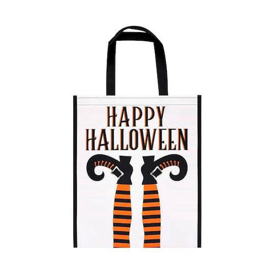 Buy the Reusable Happy Halloween Tote Bag by Celebrate It at Michaels. Featuring an orange and black stripe pattern on the sides and an upside down witch's stockings and shoes design on the front, thiā¦