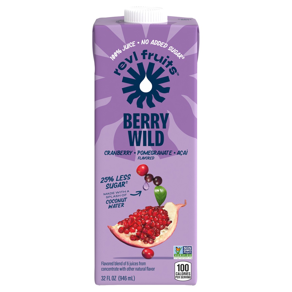 Juice is back — Revl Fruits™ Berry Wild 100% juice is straight-up yum and wildly refreshing with cranberry, pomegranate and açaí juice and a splash of coconut water. NO added sugar*. NO artificial swe…
