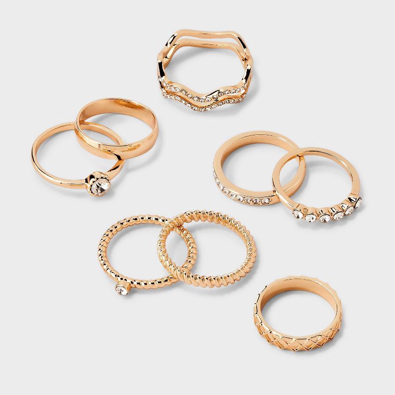 8-piece band ring set from Wild Fable™ includes a variety of designs that range from a simple band to textured to stone studded and more. Made with gold-tone metal. Perfect for everyday wear or specia…