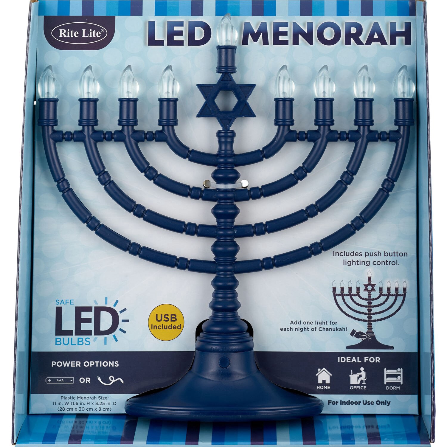 This Blue Plastic Electric Menorah features the latest in LED Technology! Powered by a Micro USB Cord (included without Wall Charger) or with 4 AAA batteries (not incl.) for the ultimate in flexibilit…