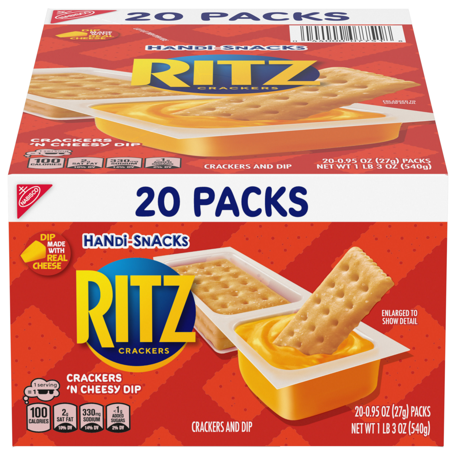 RITZ Handi-Snacks Crackers and Cheese Dip pairs the rich, buttery taste of RITZ snack crackers with a cheesy dip made with real cheese. Each of these tasty cracker packs contains 100 calories per serv…