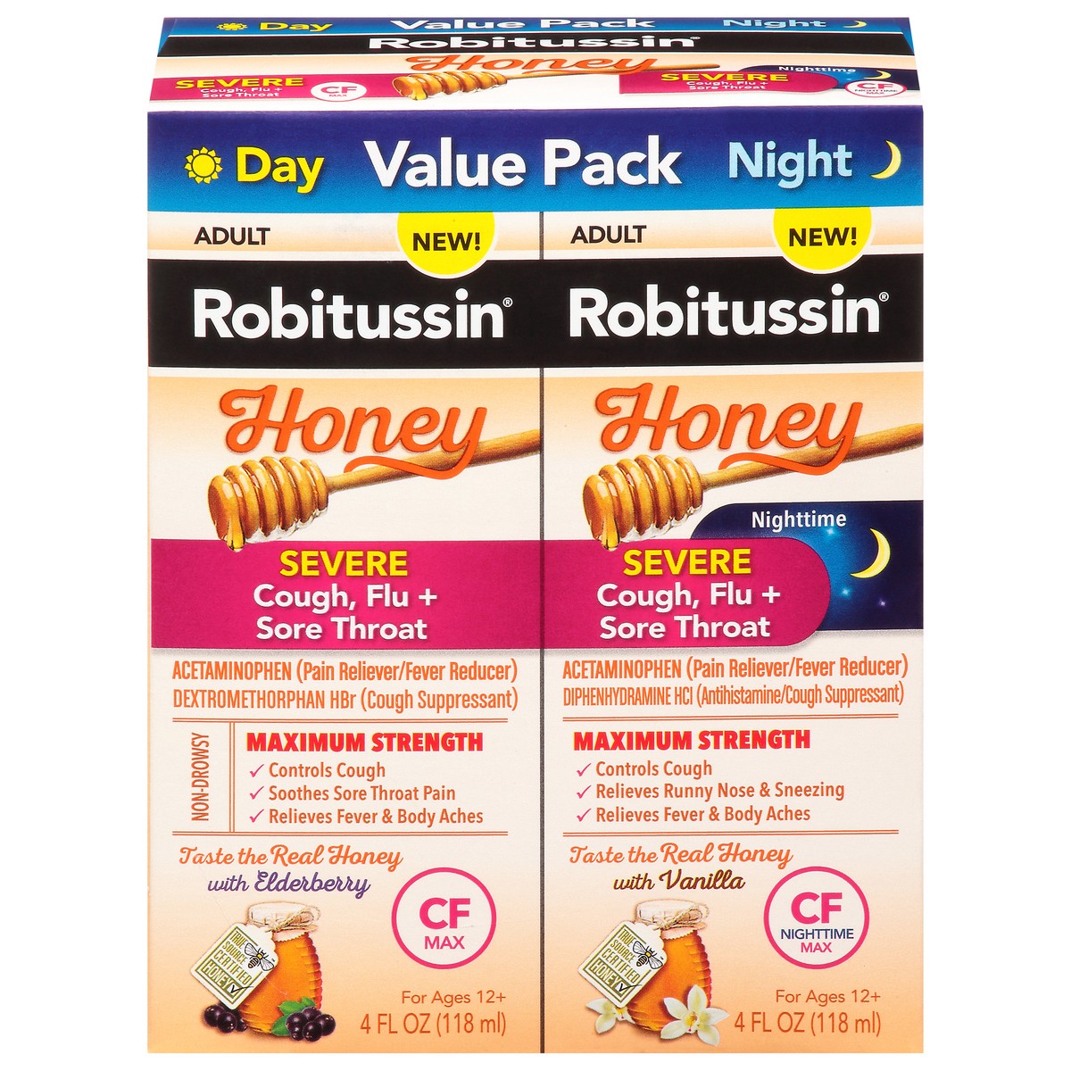 Robitussin Honey Severe Cough, Flu + Sore Throat CF Max: In Each 20 ml: Active Ingredients: Acetaminophen, USP (650 mg), Pain Reliever/Fever Reducer; Dextromethorphan HBr, USP (20 mg), Cough Suppressa…