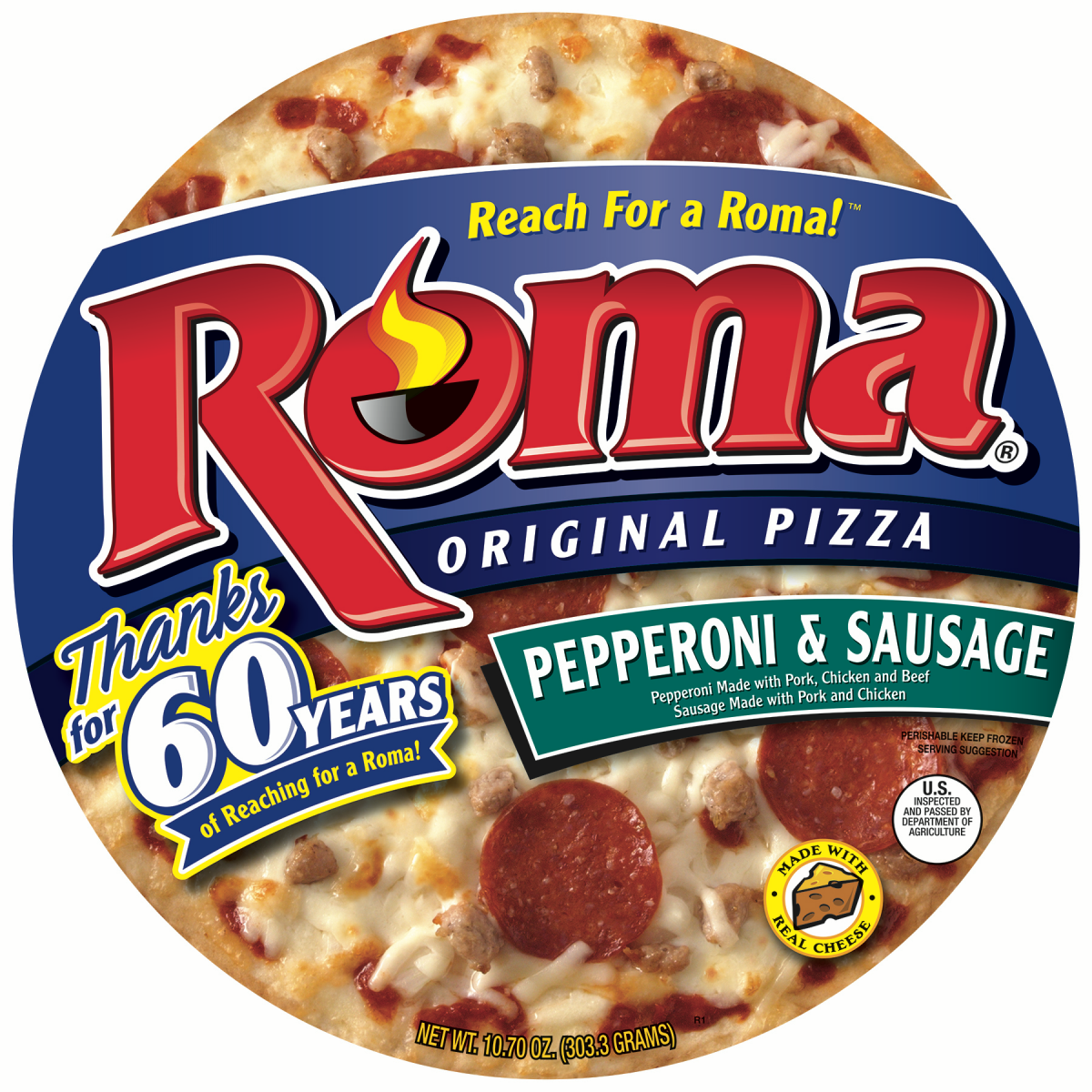 Pepperoni made with pork, chicken and beef. Sausage made with pork and chicken. Made with real cheese. Roma large pepperoni and sausage pizza. Reach for Roma! Thanks for 60 years of reaching for a Rom…