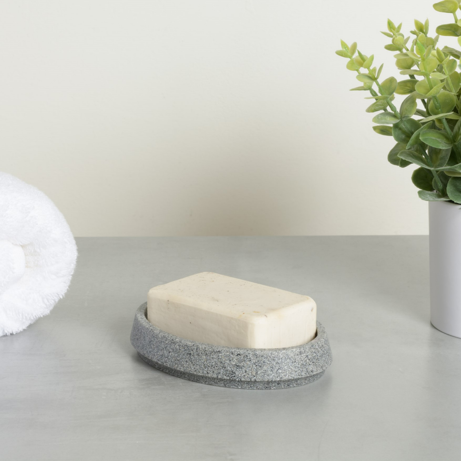 With a look inspired by the soothing essence of the outdoors, the Ezra Soap Dish has smooth curves and a tranquil sanded gray finish on its sturdy resin construction. The soap tray fits any standard s…