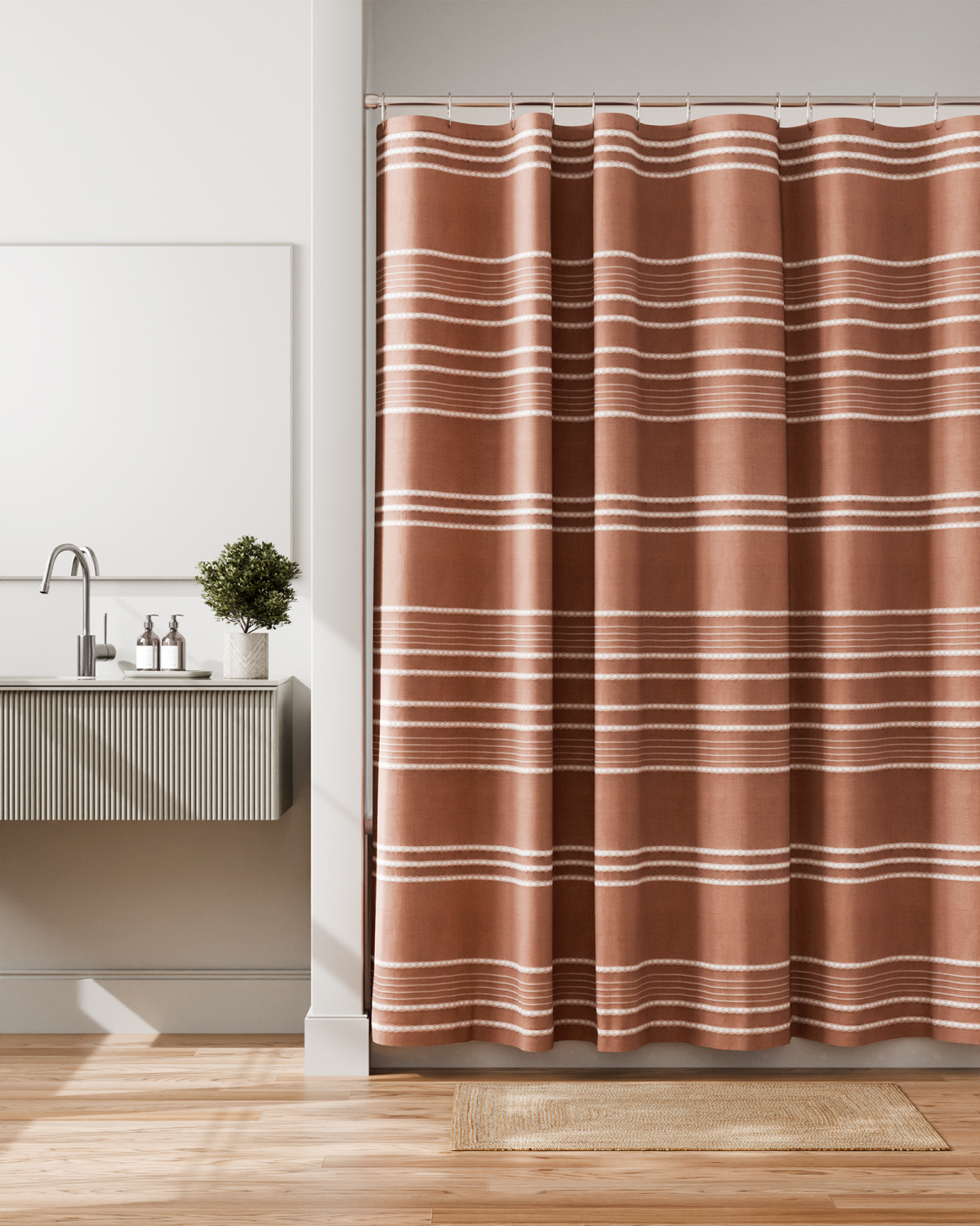 With its yarn-dyed woven stripes, subtly textured surface and organic terracotta color, the Room & Retreat Gila Fabric Shower Curtain is an easy choice to liven up a shower area. This durable curtain …