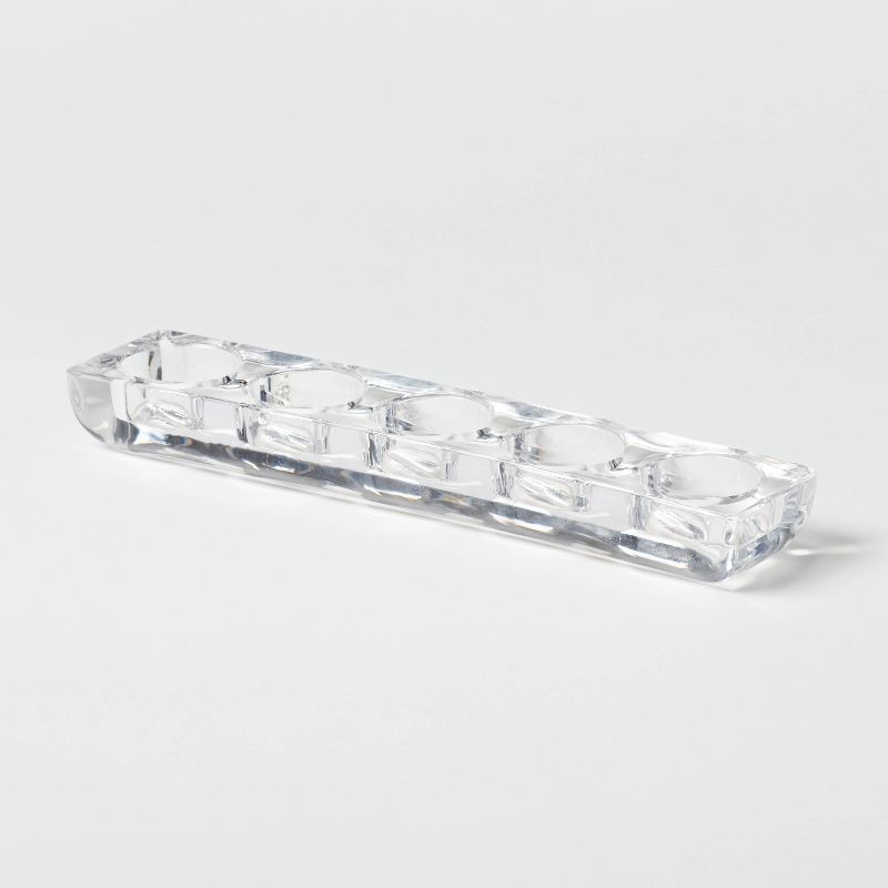 Illuminate your space with the 5 Candelabra Tealight Candle Holder - Room Essentials™. It is a sleek and stylish addition to your decor. Made from glass, this set includes five holders for candles, cr…