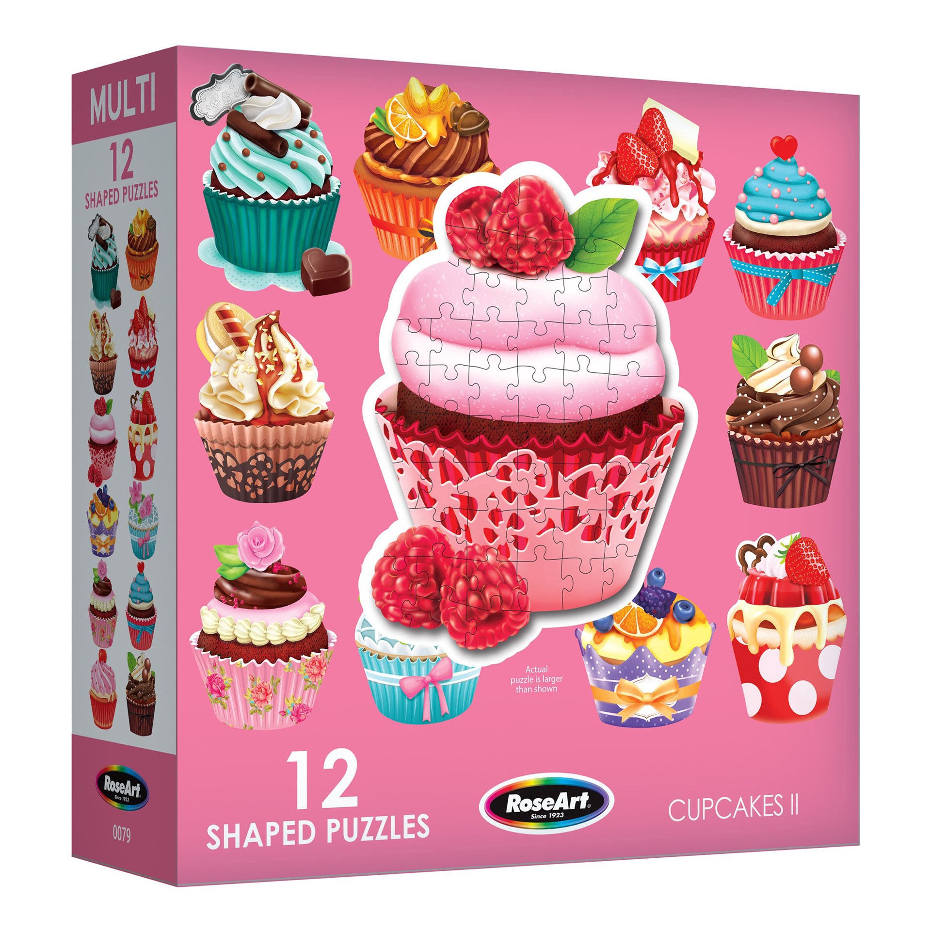 RoseArt Multi-Shaped Puzzles showcasing delectable Cupcakes. This delightful puzzle set features 12 uniquely shaped puzzles, each capturing the colorful and mouthwatering allure of cupcakes. Crafted w…