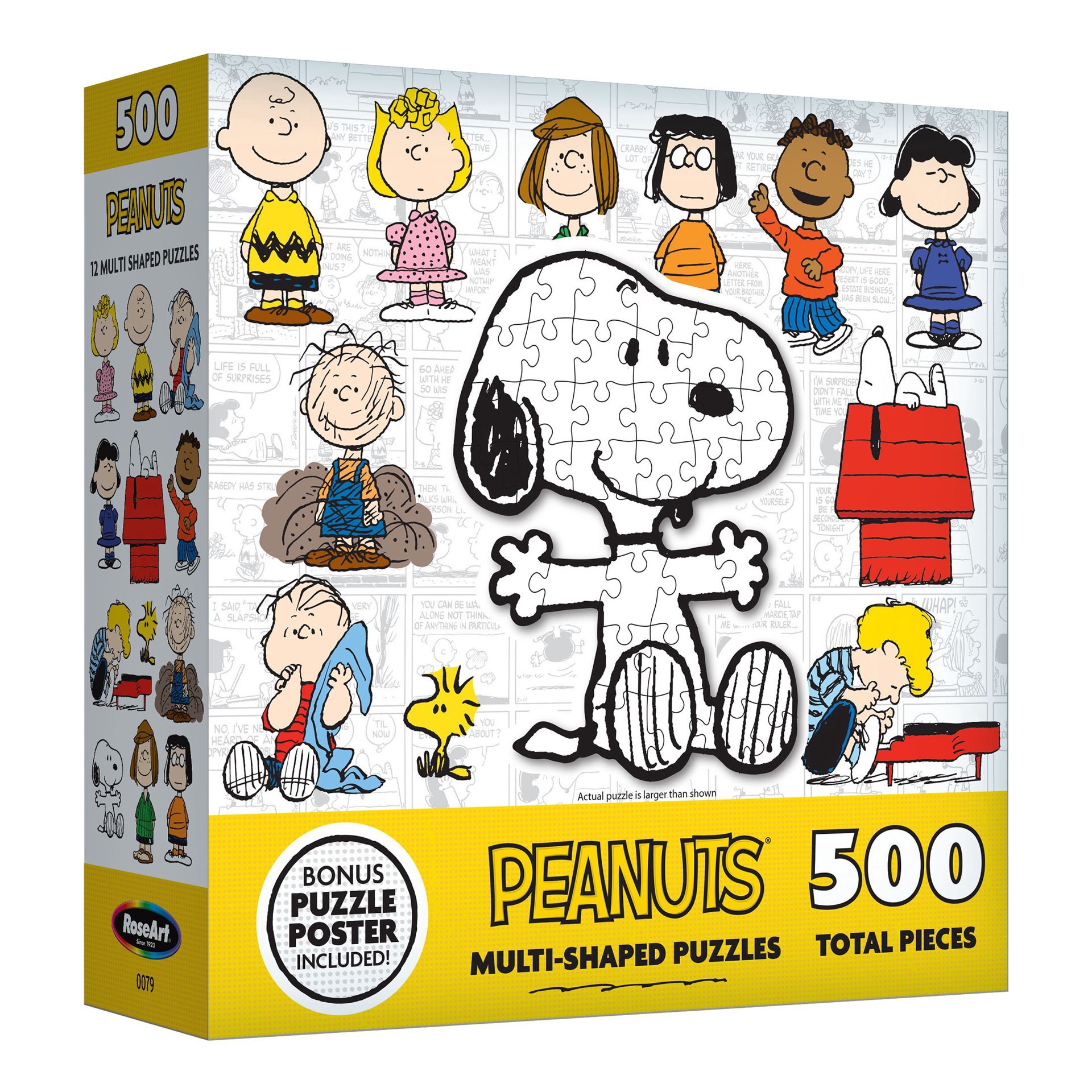 RoseArt Multi-Shaped Puzzles featuring the beloved Peanuts characters, a delightful collection of 12 uniquely shaped puzzles capturing the essence of Charlie Brown, Snoopy, Linus, Lucy, and more. Craf…