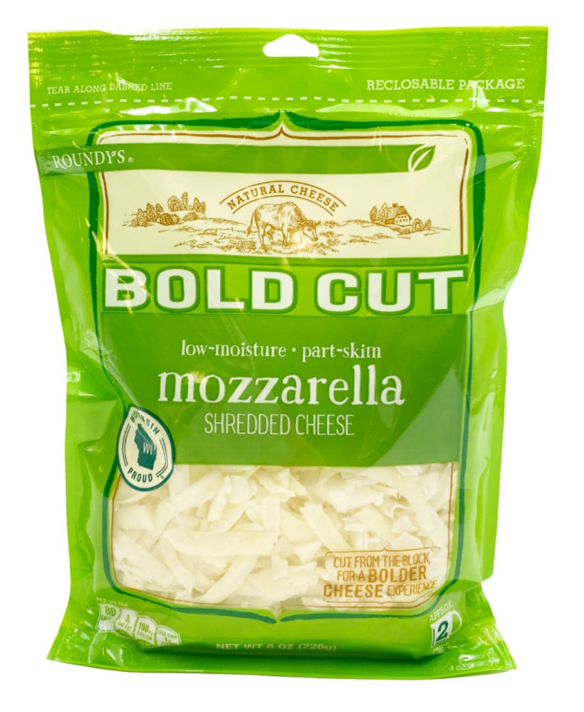 Ingredients: Low-Moisture Part-Skim Mozzarella Cheese (Cultured Pasteurized Reduced Fat Milk, Salt, Enzymes), Anticake (Potato Starch, Powdered Cellulose), Natamycin (Natural Mold Inhibitor).