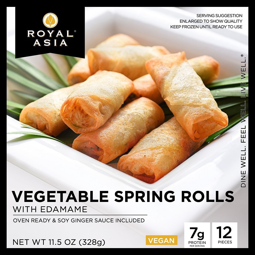 7 g protein serving. Vegan. Oven ready & soy ginger sauce included. Dine well. Feel well. Live well. Royal Asia Vegetable Spring Rolls are fresh frozen and delicious. Our chefs use quality fresh ingreā¦