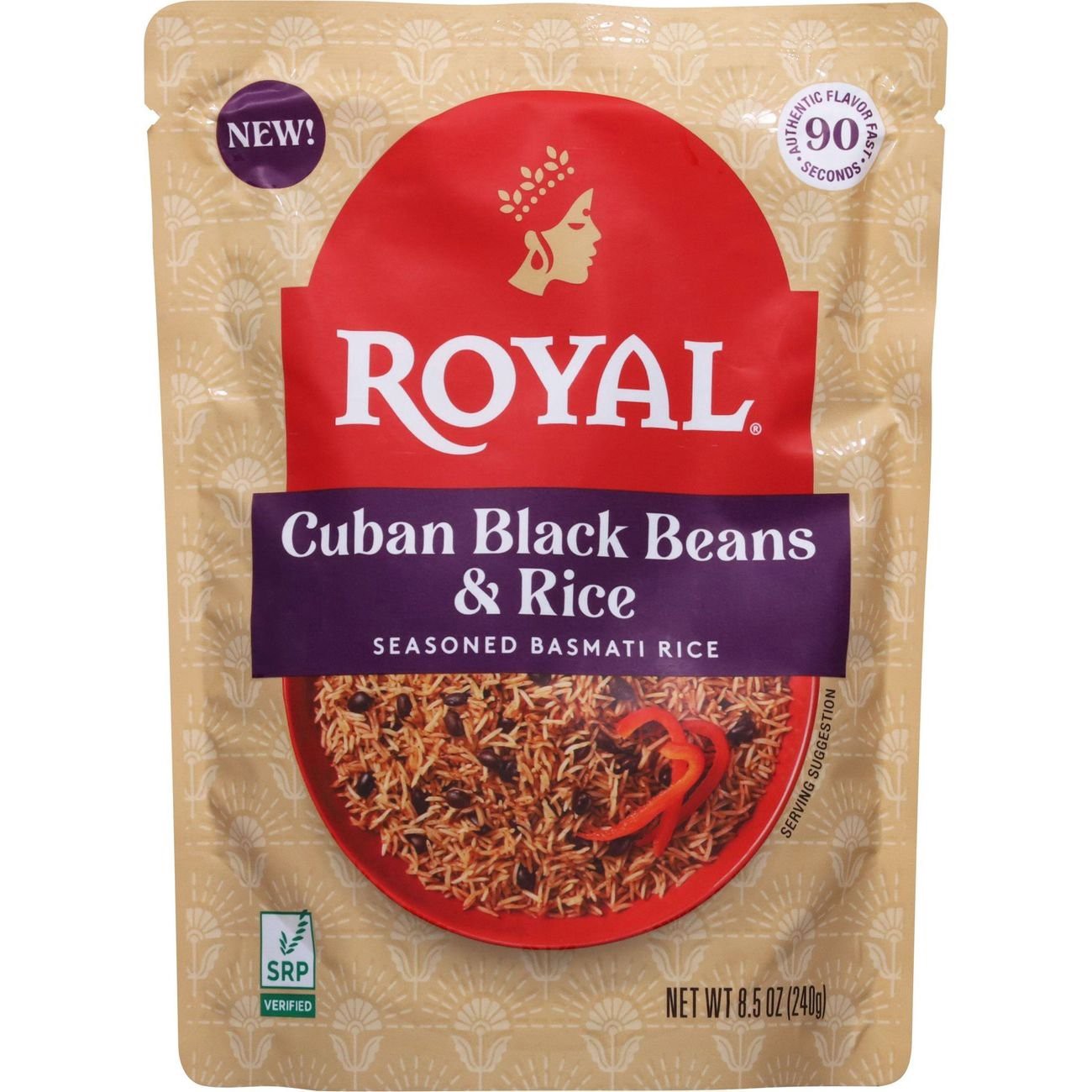Royal Rice Ready to Heat and Eat Cuban Black Beans & Rice, Cuban-inspired black beans, seasoned with onion and red bell peppers, combined with extra-long grain Basmati Rice.