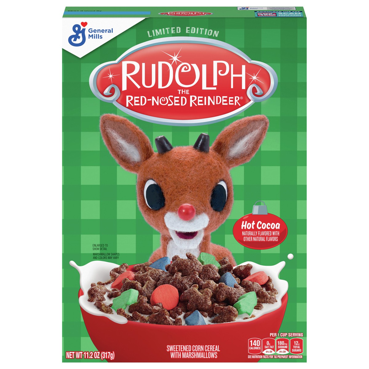 General Mills Rudolph the Red Nosed-Reindeer is Hot Cocoa flavored Corn Cereal with Marshmallows