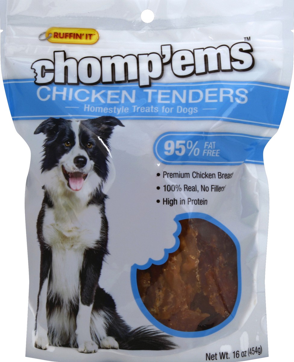 95% fat free. Premium chicken breast. 100% real, no fillers! High in protein. 100% delicious, guaranteed! Give your dog something special! Ruffin' It Chomp'ems Chicken Tenders are a safe, healthy trea…
