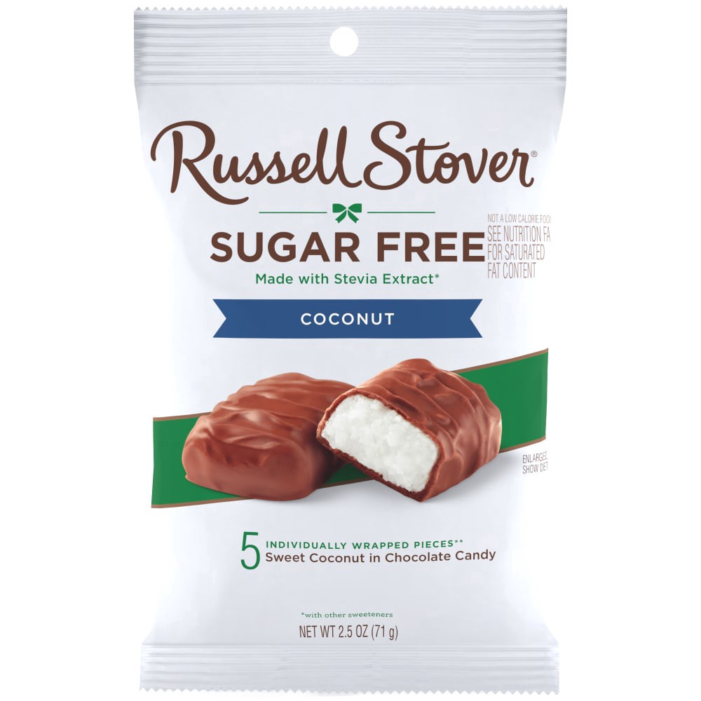 Indulge in the irresistible taste of RUSSELL STOVER Sugar Free Coconut in Chocolate Candy. Each 2 oz. bag contains about 4 individually wrapped pieces of sweet coconut filling wrapped in our delicious…