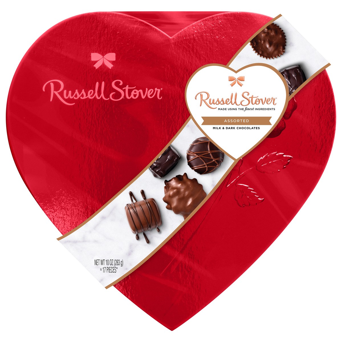 Celebrate Love with a RUSSELL STOVER Valentine's Day Red Foil Heart Assorted Milk Chocolate & Dark Chocolate Gift Box, 10 oz.! This gorgeous heart shaped box contains a 17 piece assortment of 9 delici…