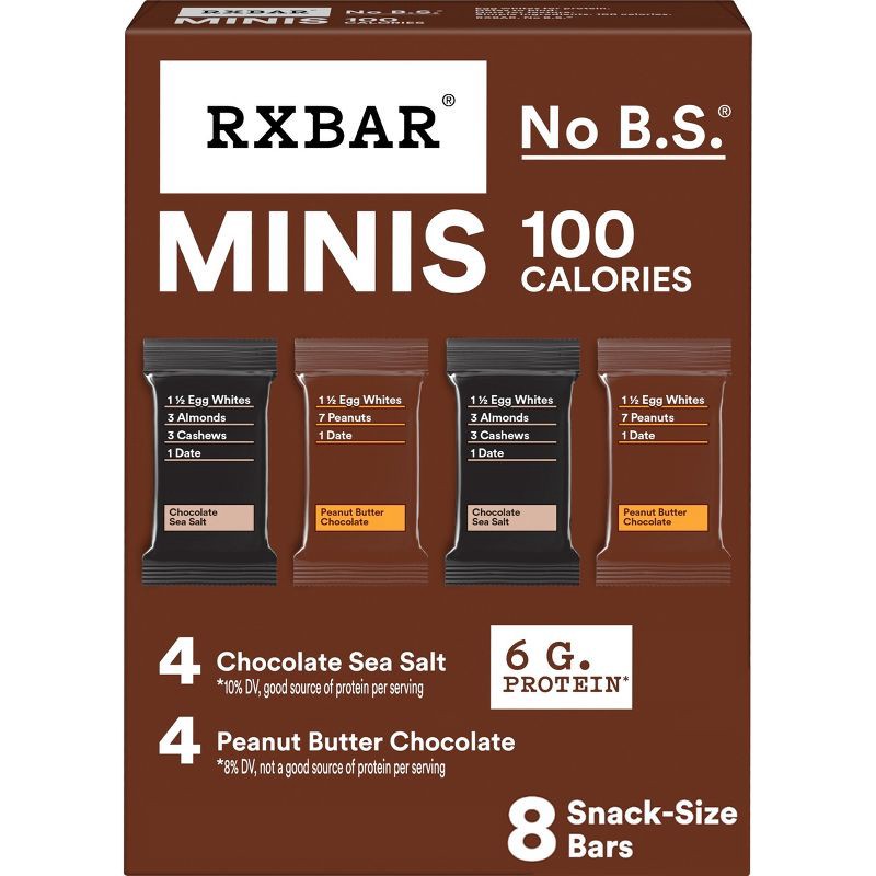 - Mini protein bars made with simple ingredients; 100 calories per serving; Includes RXBAR Chocolate Sea Salt and RXBAR Peanut Butter Chocolate