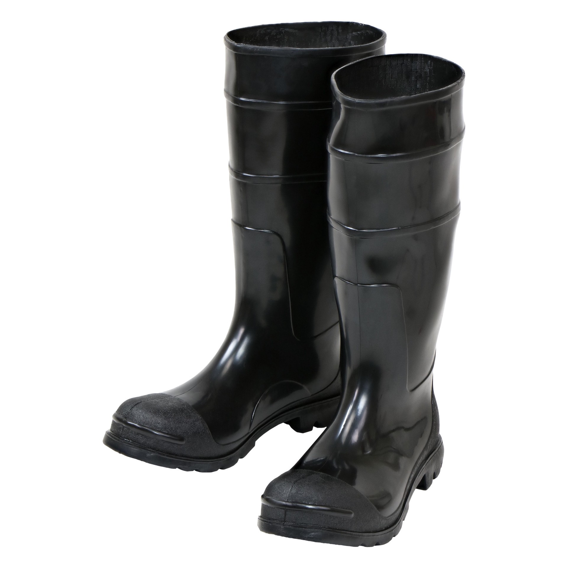 Size-11 black PVC steel-toe/shank over-the-sock boot. Textured sole for added traction. Removable insole. Clean by spraying down the boots with water and let dry. Prop 65 warning: this product contain…