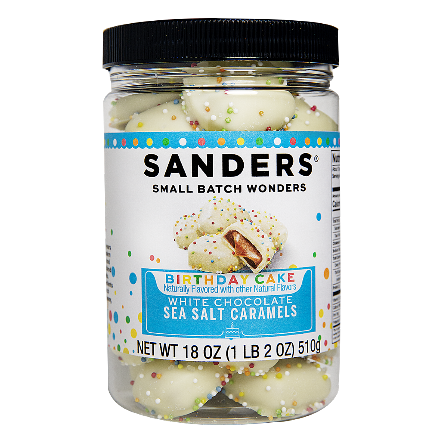 Sanders White Chocolate Sea Salt Caramels are slow cooked in small batch kettles, infused with Birthday Cake flavor then draped in premium white chocolate and sprinkled with naturally colored sprinkle…
