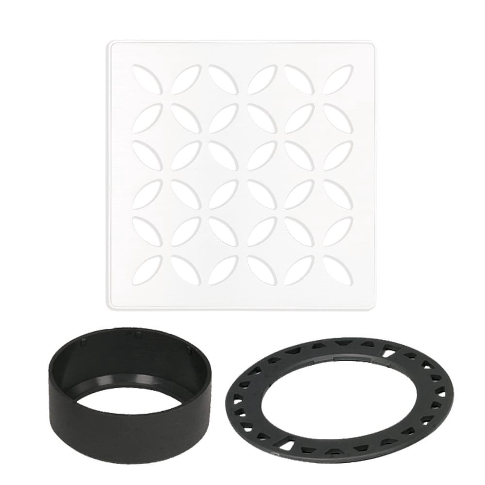 4-In square grate. Matte white finish in floral design. Use with Kerdi-Drain flange sold separately. Package includes 4 in square grate and frame, height adjustment collar and lateral adjustment ring.…
