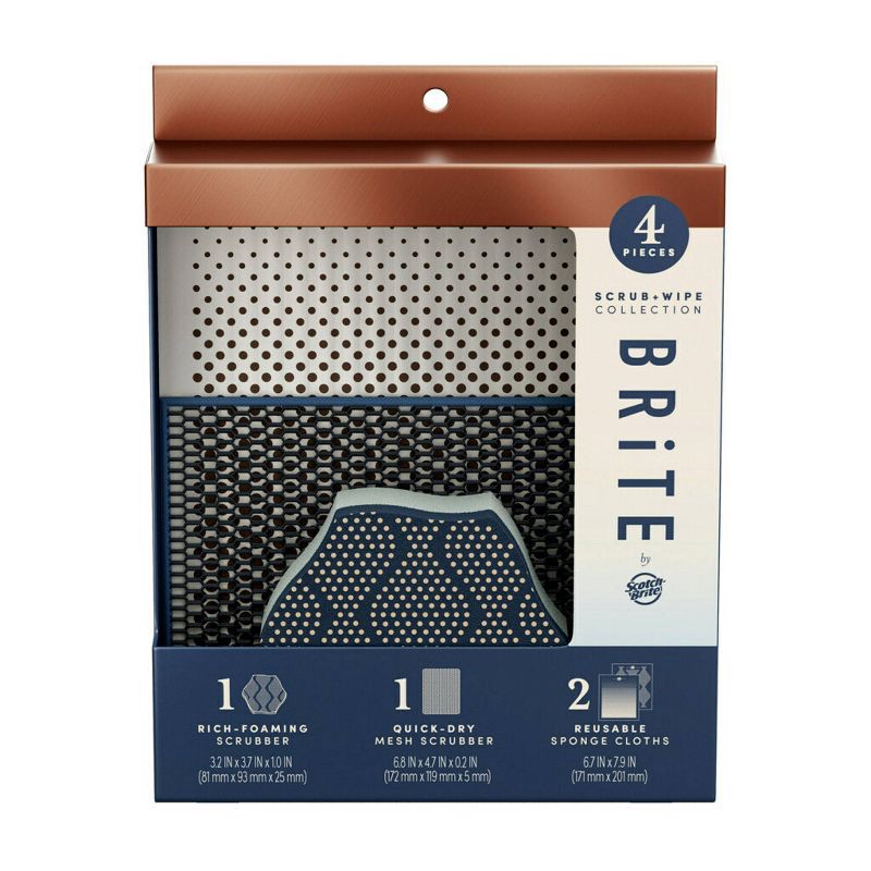A BRiTE day is ahead of you with the BRiTE by Scotch-Brite Scrub and Wipe Collection, featuring one rich-foaming dish scrubber, one quick-dry mesh scrubber, and two reusable sponge cloths. The rich-fo…