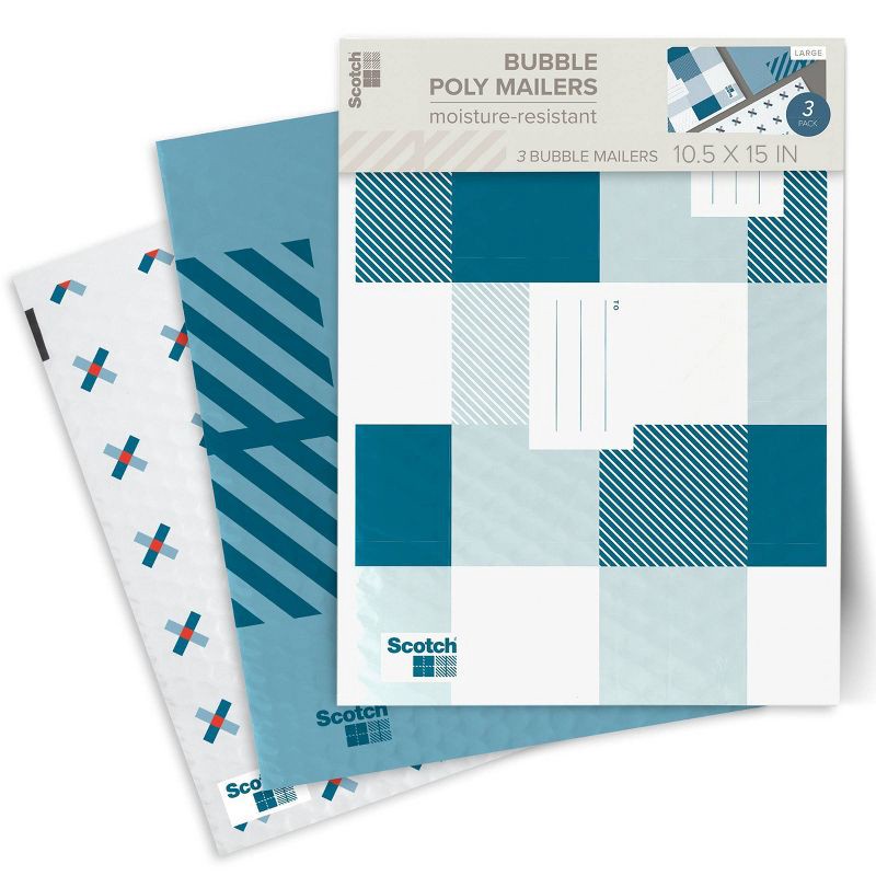 - POLY BUBBLE MAILERS IN ASSORTED BLUE DESIGNS: Three blue Scotch Poly Bubble Mailers in Size 5 Large, with interior dimensions of 10.5 in. by 15 in.