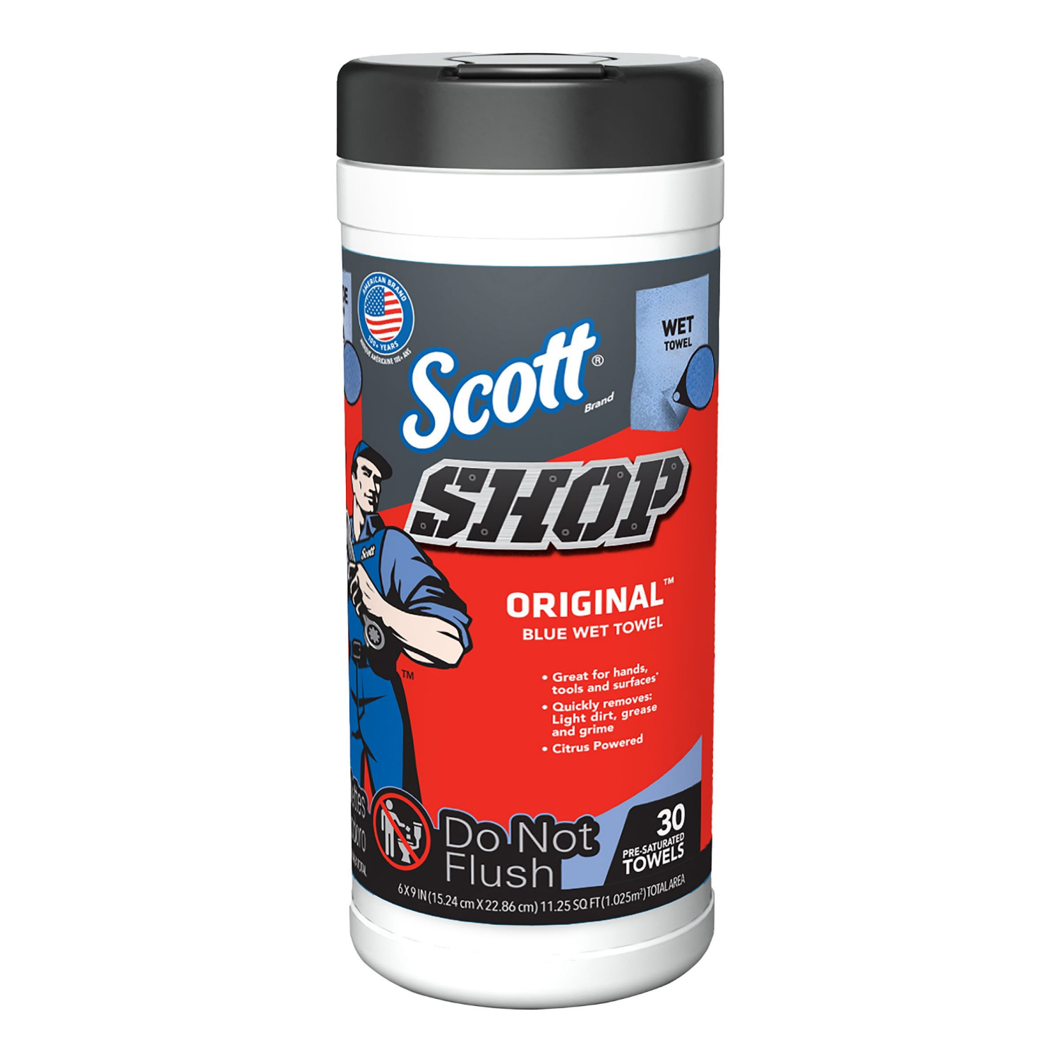 Scott® Shop Original Blue Wet Towels are made by Scott®, the #1 Shop Towel Brand. The smooth, cloth-like disposable towels come in an easy-to-store canister and feature a powerful citrus cleaning form…