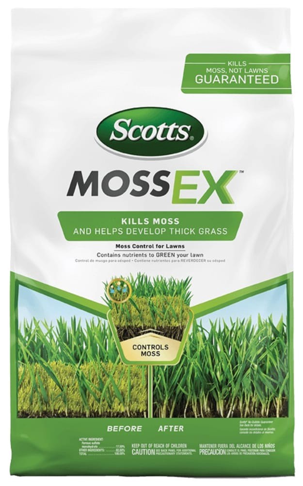 Kill moss, not your lawn, with Scotts® MossEX™. Scotts® MossEX™ provides nutrients for your grass to prevent future moss problems. Apply easily with a Scotts® spreader during winter or spring when mos…