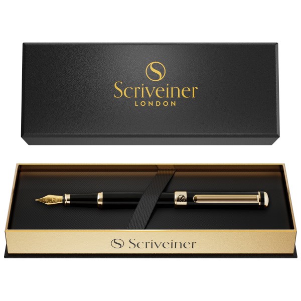 Scriveiner Classic Fountain Pen, Medium Point, 0.7 mm, Black/Gold Barrel, Black/Blue Ink