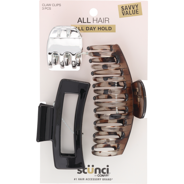This 3-pack of claw clips is something to get really excited about because it is such a SAVVY VALUE! This pack features three claw clips in mixed shapes, finishes, and sizes. Be on-trend with this var…