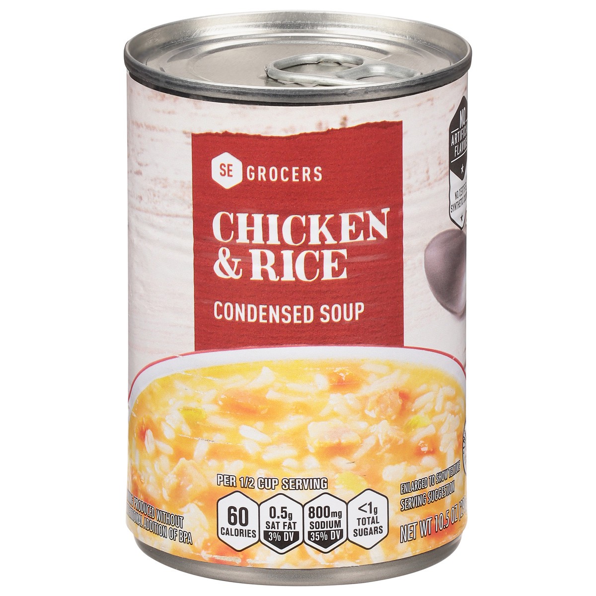 Chicken Stock, Rice, Carrots, Cooked Chicken Meat, Contains Less than 2% of: Potato Starch, Salt, Cooked Mechanically Separated Chicken Meat, Chicken Fat, Celery, Sea Salt, Potassium Chloride, Sugar, …