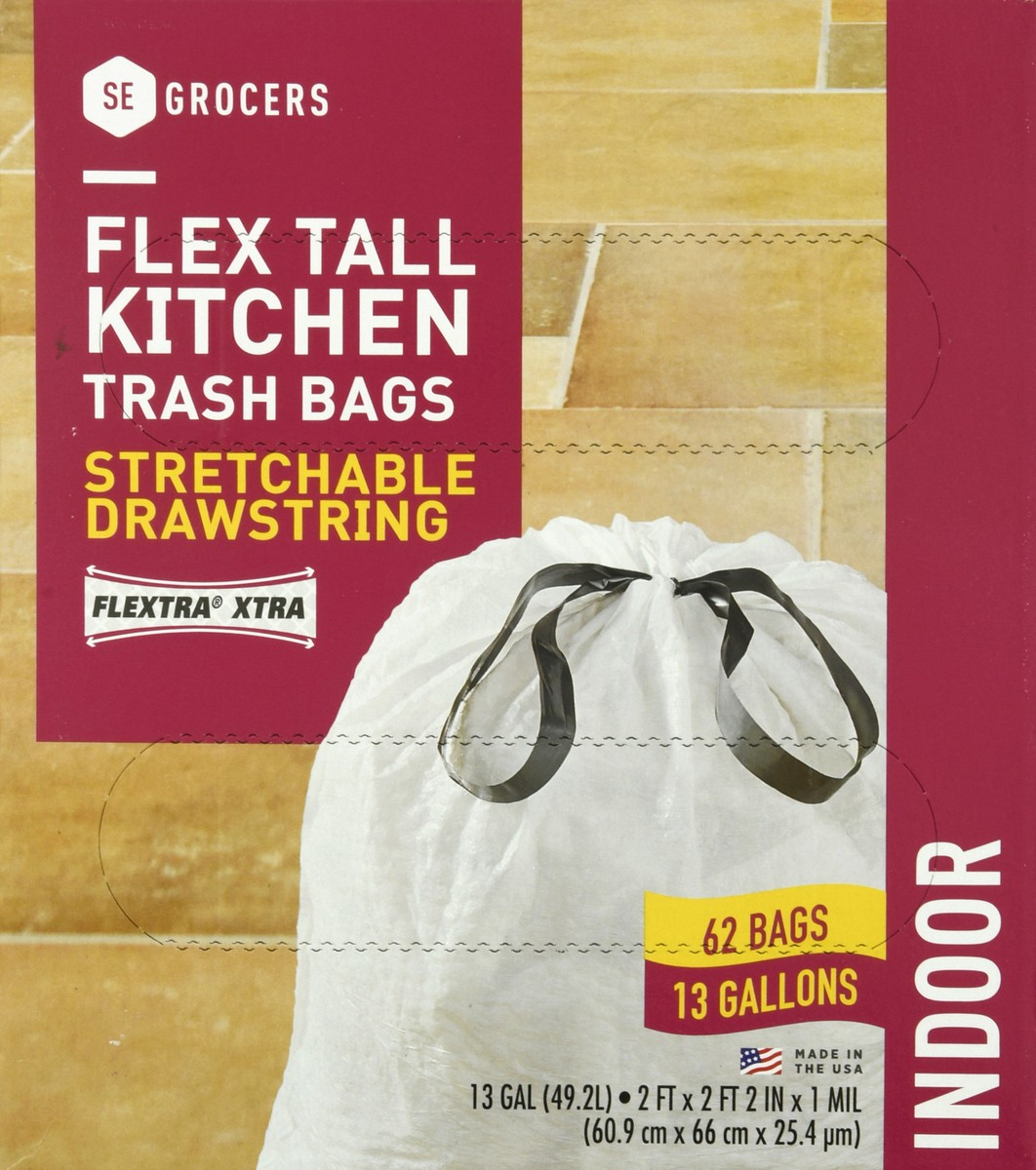 13 gal (49.2l). 2 ft x 2 ft in x 1 mil (6.9 cm x 66 cm x 25.4 μm). Flextra Xtra. We care about our products, which is why we offer quality goods at an affordable price. SE Grocers has everything you c…
