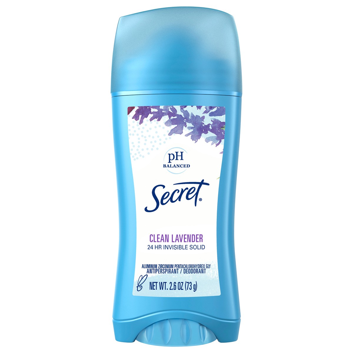 24 hr invisible solid. PH balanced. Aluminum zirconium trichlorohydrex gly. www.secret.com. www.pg.com. Questions? 1-800-964-1947.