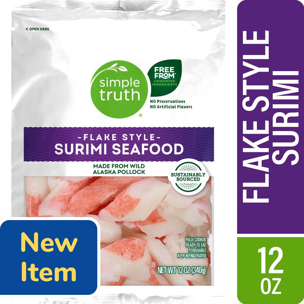 Simple Truth® Flake Style Surimi Seafood is a sustainably sourced delight! Made from wild Alaska pollock, it's fully cooked and ready to eat. Enjoy a versatile, gluten free, non-GMO meal option that h…