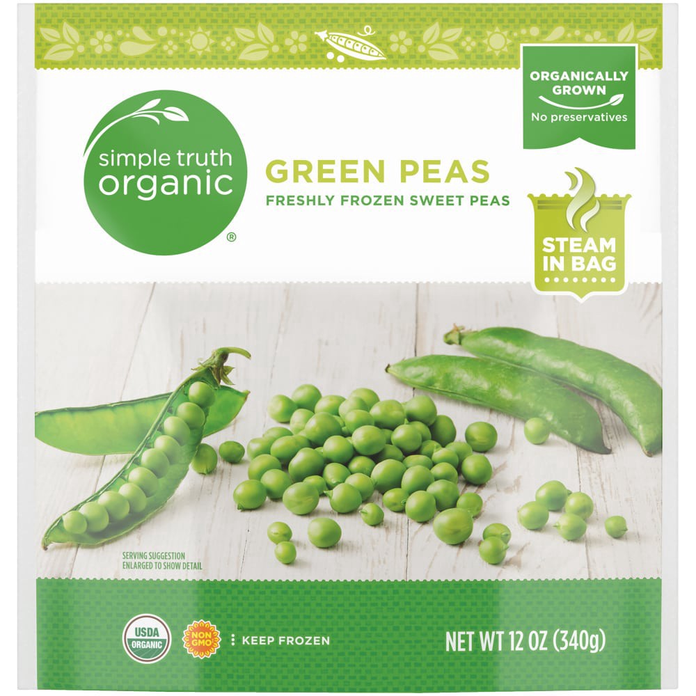 Simple Truth Organic® Frozen Peas Green burst with authentic, organically grown goodness. Non-GMO, these green peas have no preservatives added. Frozen at peak freshness, the sweet peas have a superio…