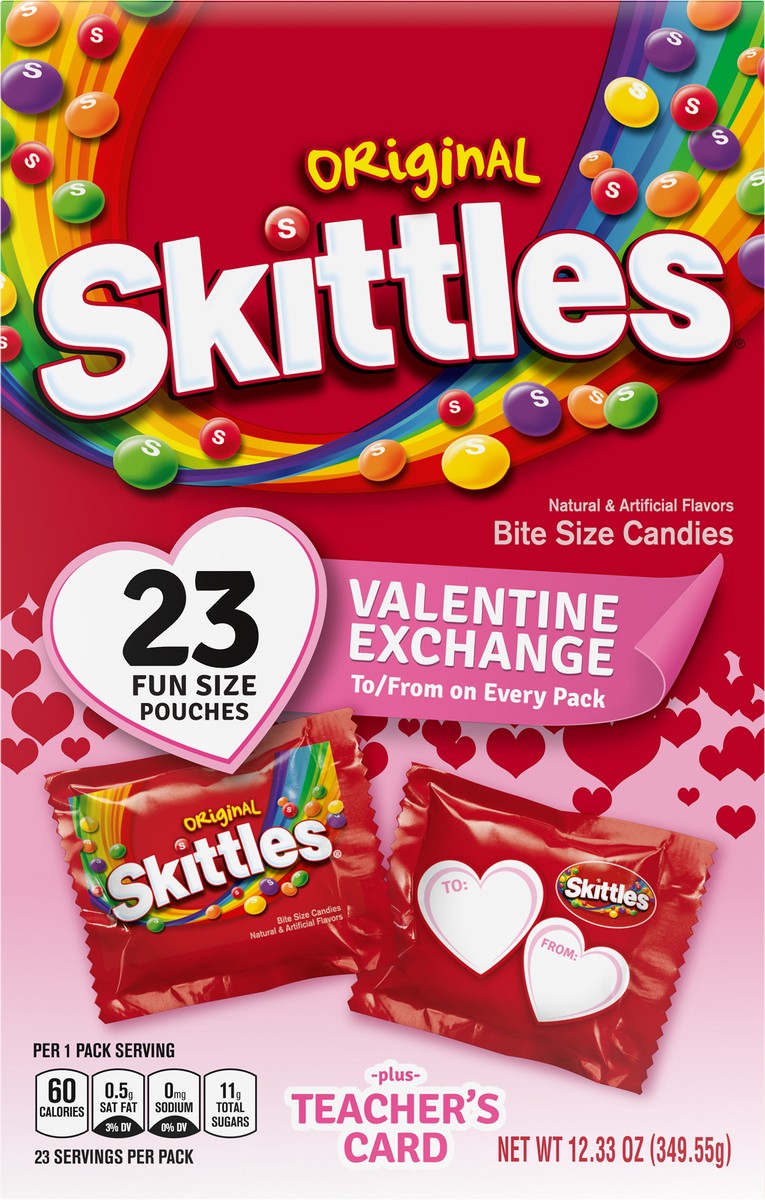 What the world needs now is love- chewy, fruity, sweet love. This Valentine’s Day spread love with SKITTLES Original Valentine's Day Exchange Fun Size Chewy Candy. This 12-ounce box contains 23 indivi…