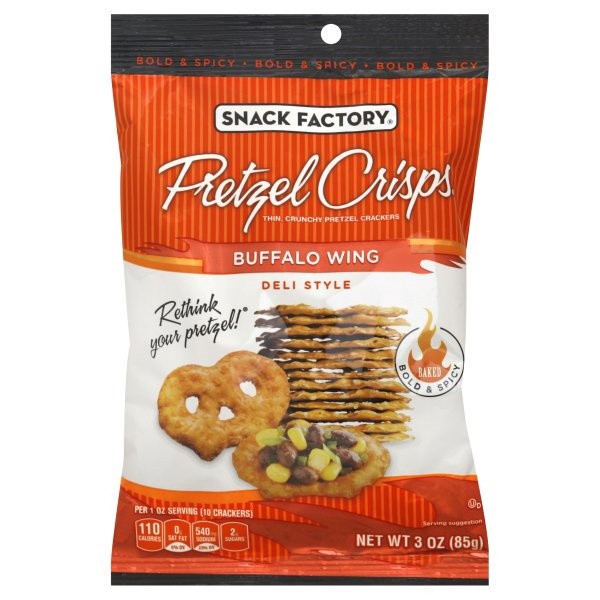 Snack Factory Buffalo Wing Pretzel Crisps are a modern twist on traditional pretzels. Made with quality ingredients and baked up with a sprinkling of spicy flavor on top, they''re a gourmet alternativ…