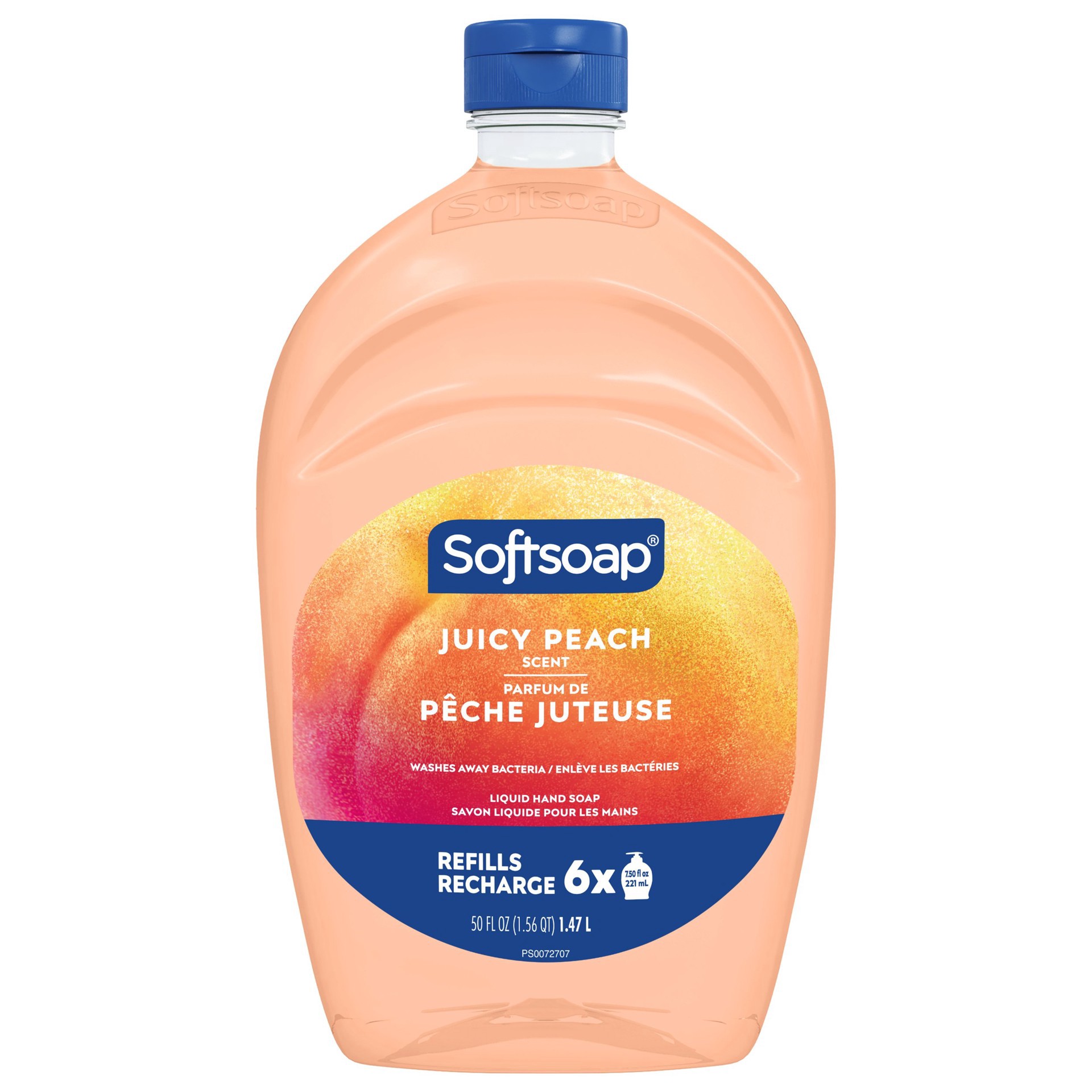 With a rich fruity scent, Softsoap liquid hand soap in Juicy Peach is a hand soap youâll want to keep on your sink to infuse every small moment with joy. This liquid hand soap effectively washes awa…