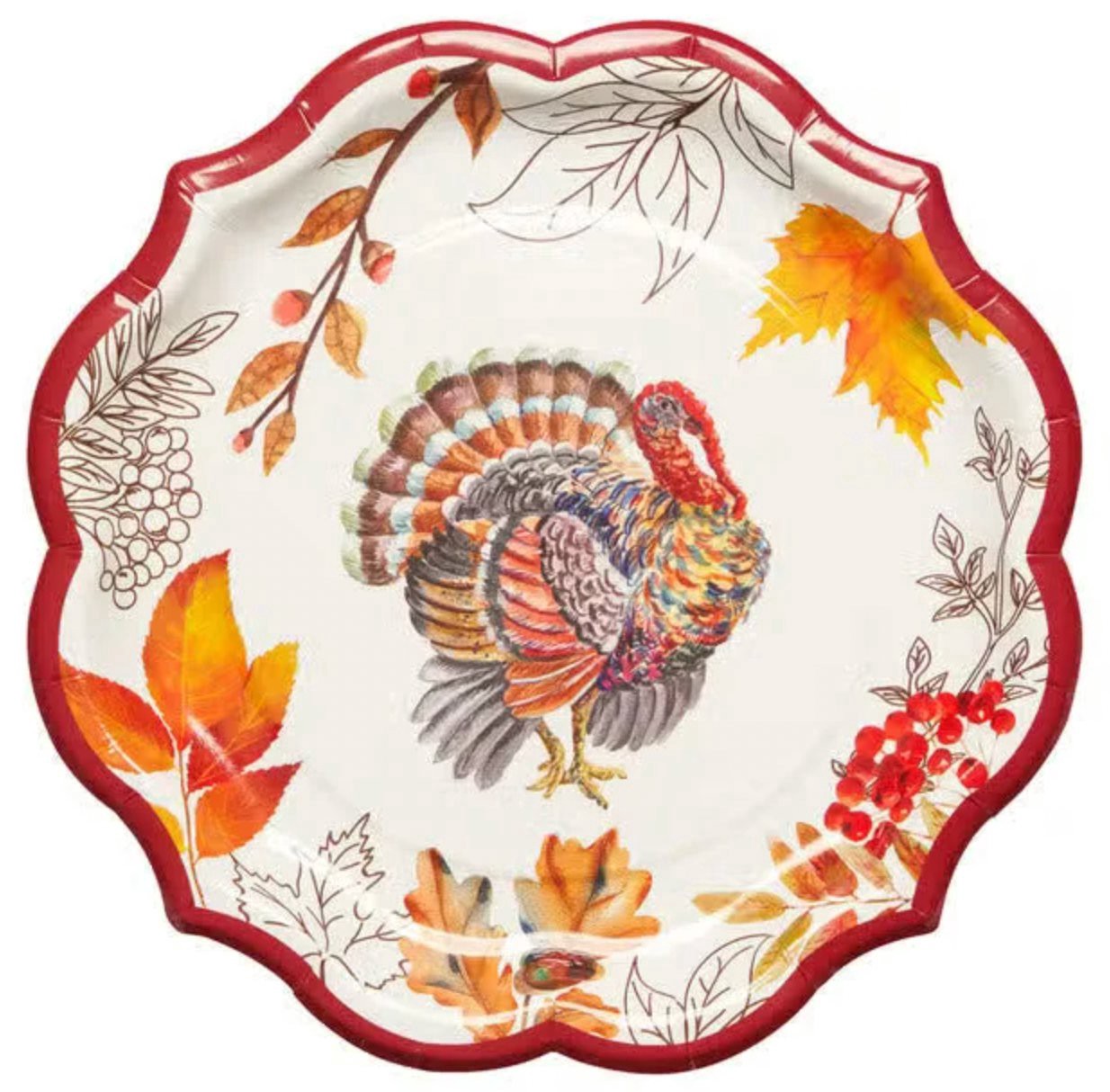These stunning paper plates will make you want to host a party at the first chance you get! These ruffled edge plates show falling leaves and a turkey on a beautiful background! Add a touch of eleganc…