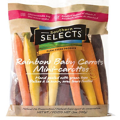 Southern Selects peeled baby carrots with tops bring color, texture and flavor to the plate. Our hand peeled carrots have their clipped green tops in place to create a great presentation and show fres…