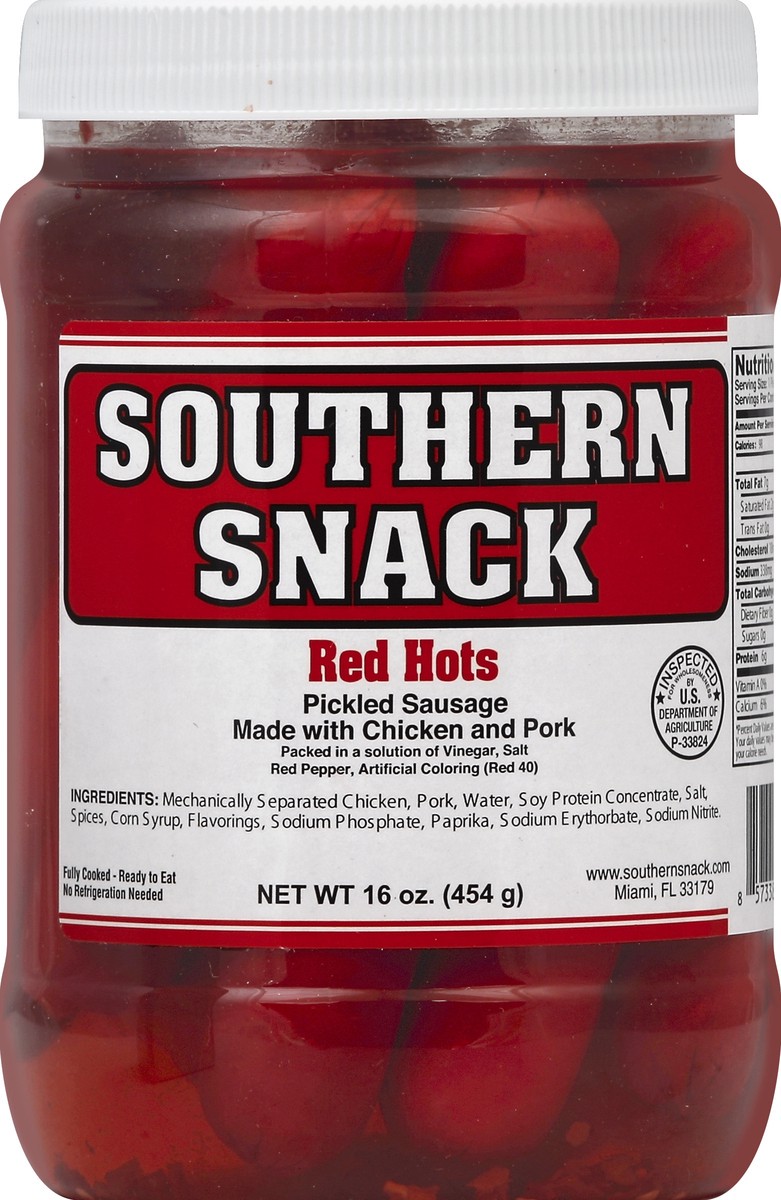 Made with chicken and pork. Packed in a solution of vinegar, salt, red pepper, artificial coloring (red 40). Inspected for wholesomeness by US Department of Agriculture. Fully cooked - ready to eat. N…