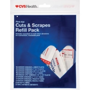 CVS Health cuts and scrapes refill pack includes essentials to help clean and cover minor abrasions. Leave it in your car, desk, medicine cabinet or all three so you'll always be prepared. Including a…
