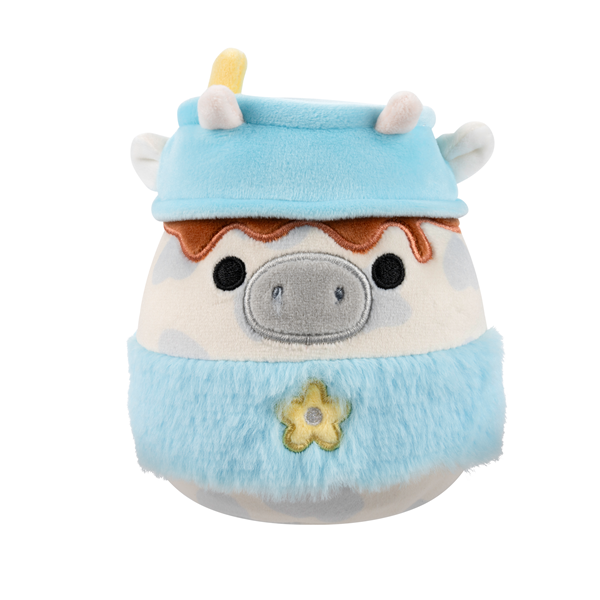 Squishmallows Mustafa - Grey And White Spotted Cow Latte With Blue Fuzzy Sleeve